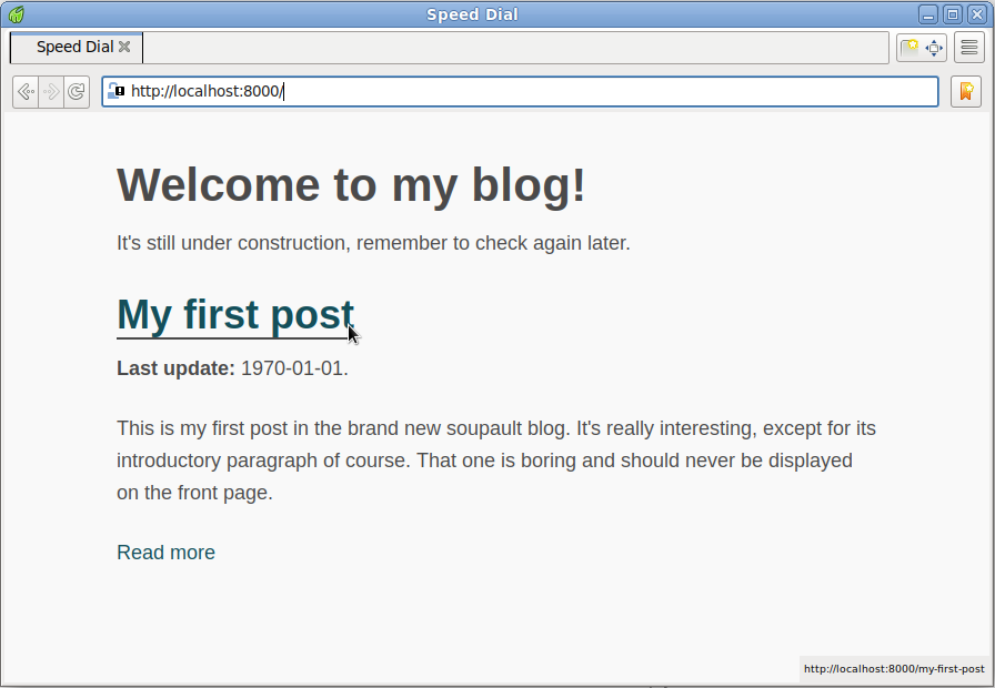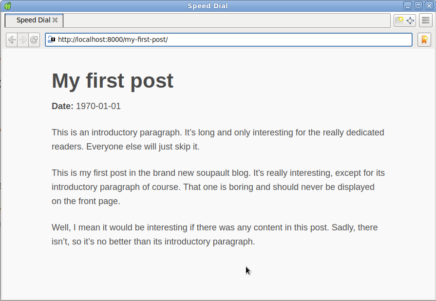 "excerpt": "This is my first post in the brand new soupault blog. It’s really interesting, except for its\nintroductory paragraph of course. That one is boring and should never be displayed on the front page.",