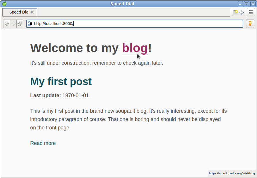 Soupault gives you total control over your page assembly process, at cost of a bigger initial setup effort. For this tutorial, we’ll start with a very simple page.
